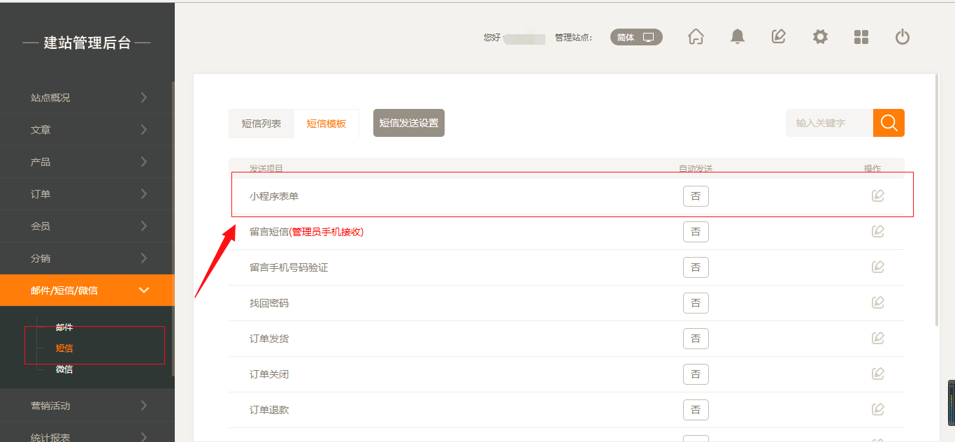 3.点击“短信发送设置”,输入所有信息之后点击保存,然后将“自动发送”改为“是”,即可,如图所示: