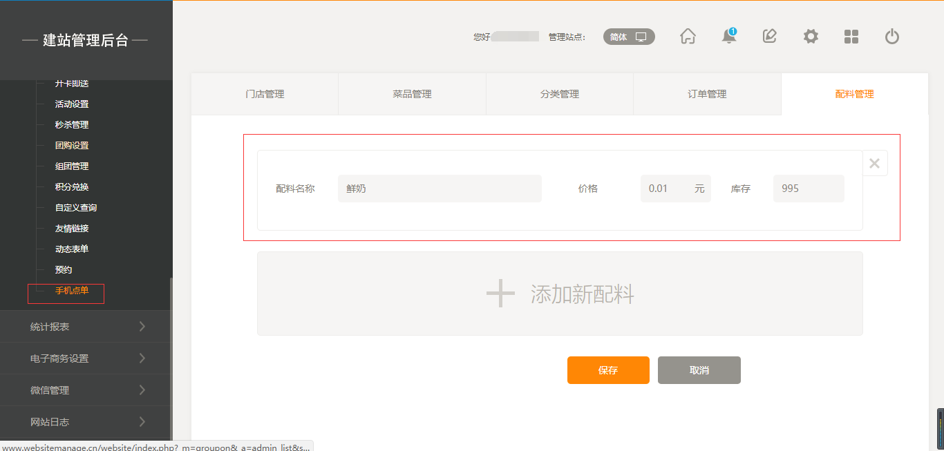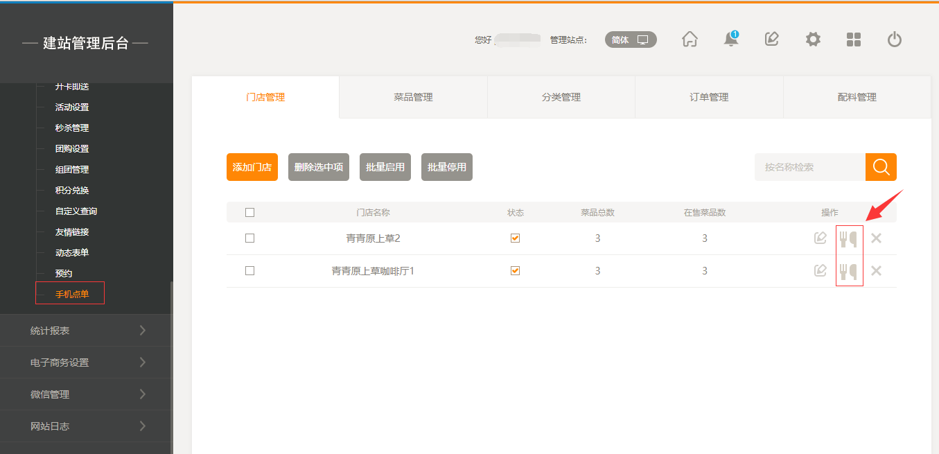 1.首先,点击“后台管理”-“手机点单”-“门店管理”-“添加门店”,填写完店面信息之后,我们点击保存即可(注:1.首先需要填写店面的地址然后可以拖动地图进行精确;2.店面最多添加30家店面),保存之后,我们添加菜品时有两个入口,一个是店面所对应的入口,一个是在菜品管理中可以选择所属店面,如图所示: